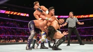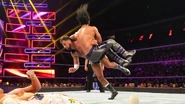 With Ali on defense, Gulak unleashed his technical ability, keeping Ali grounded. However, Gulak and Itami grew frustrated with TJP as he continued to break up pinfalls. Conspiring against Ali, the three came up with a strategy to take down their opponent until The Fil-Am Flash rolled up Gulak following a suplex. With the alliance crumbling, Ali launched himself off the top rope and took down his opponents.