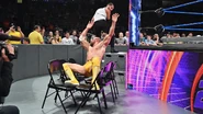 Lorcan tossed chairs into the ring, but The Persian Lion turned the tables and dropped his rival once again to the outside, driving Lorcan into the announce table before retrieving a garbage can.