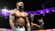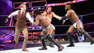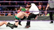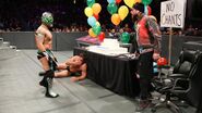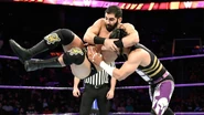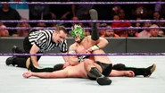 Being careful not to destroy the cake at ringside, Gulak tried to force Kalisto to submit back inside the ring. The former Cruiserweight Champion managed to escape, catching a second wind and forcing Gulak to play defense. As they battled back and forth, Kalisto lined up his opponent for a high-flying move, only to be taken out by Enzo.