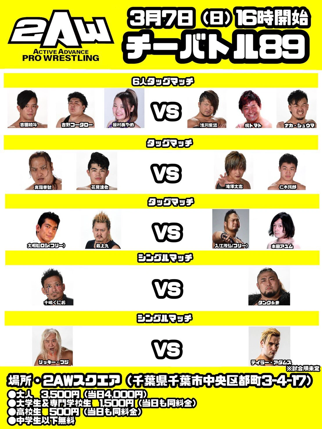 2AW ChiBattle 89 was a professional wrestling event produced by Active Advance Pro Wrestling. It took place March 7, 2021 in Chiba, Japan at the 2AW Square.