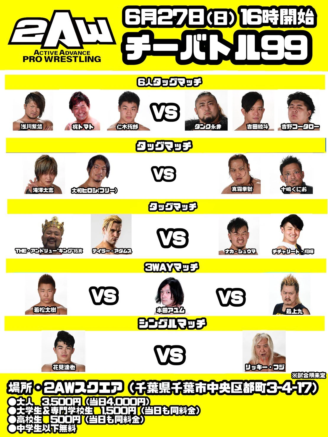 2AW ChiBattle 99 was a professional wrestling event produced by Active Advance Pro Wrestling. It took place June 27, 2021 in Chiba, Japan at the 2AW Square.