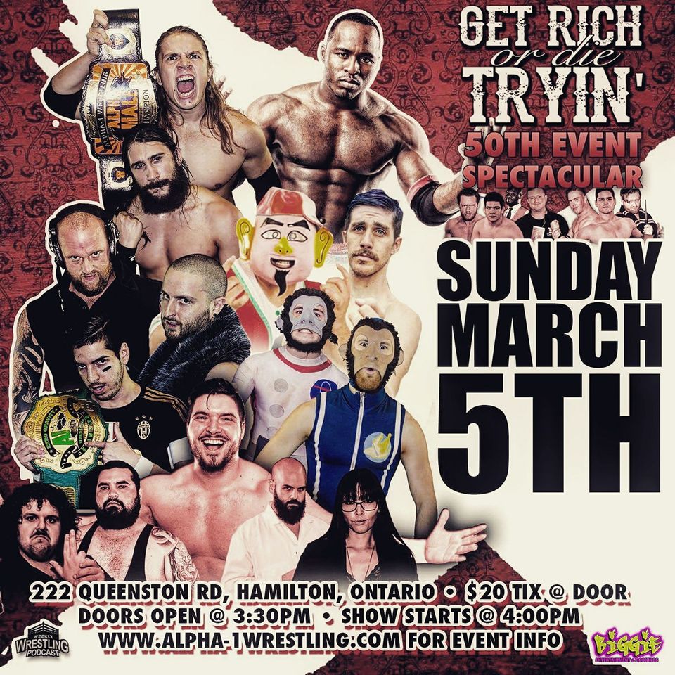 A1 Get Rich Or Die Tryin' was a professional wrestling event promoted by Alpha-1 Wrestling (A1). The event took place on March 5, 20177 at the Hamilton Knights Of Columbus Hall in Hamilton, Ontario. It was broadcast on niconico.jp.
