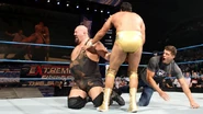 Although Rhodes attempted to hit Show with a Kendo Stick after the bell, anger seemed to be the only effort he provoked from the giant. He then tried to wield a steel chair, only to have it punched out of his hand. Refusing to give up his advantage, the grandson of a plumber took off his belt to use as a weapon. However, before he could, the World's Largest Intercontinental Champion delivered a fierce kick, yanking the belt out of Rhodes' hand before turning it on its owner.