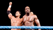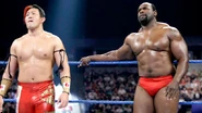 The first match Teddy presided over involved SmackDown's hot, up-and-coming tag team that he himself had not signed when he was SmackDown General Manager: Titus O’Neil and Darren Young. After they neutralized The Personification of Domination in the match's final seconds, the powerful Titus held Tatsu high in the air. This allowed his partner “Mr. No Days Off” Young to closeline his Japanese opponent, paving the way for O’Neil to pick up another huge pin fall.