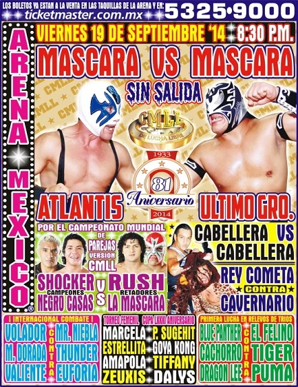 The CMLL 81st Anniversary Show was a major professional wrestling event produced by Consejo Mundial de Lucha Libre (CMLL) that took place on September 19, 2014, in CMLL's home arena Arena México in Mexico City, Mexico. The event commemorated the 81st anniversary of the creation of CMLL, which is the oldest professional wrestling promotion in the world. CMLL's anniversary show is their biggest, most important show of the year, comparable to the Super Bowl for the National Football League or WrestleMania for World Wrestling Entertainment. The main event of the show was a best two-out-of-three falls Lucha de Apuestas, or "bet match" between perennial rivals Atlantis and Último Guerrero, with both wrestlers putting their mask on the line. The show featured five more matches. The show made CMLL only the second promotion in the Americas, after WWE, to draw a $1 million gate.
