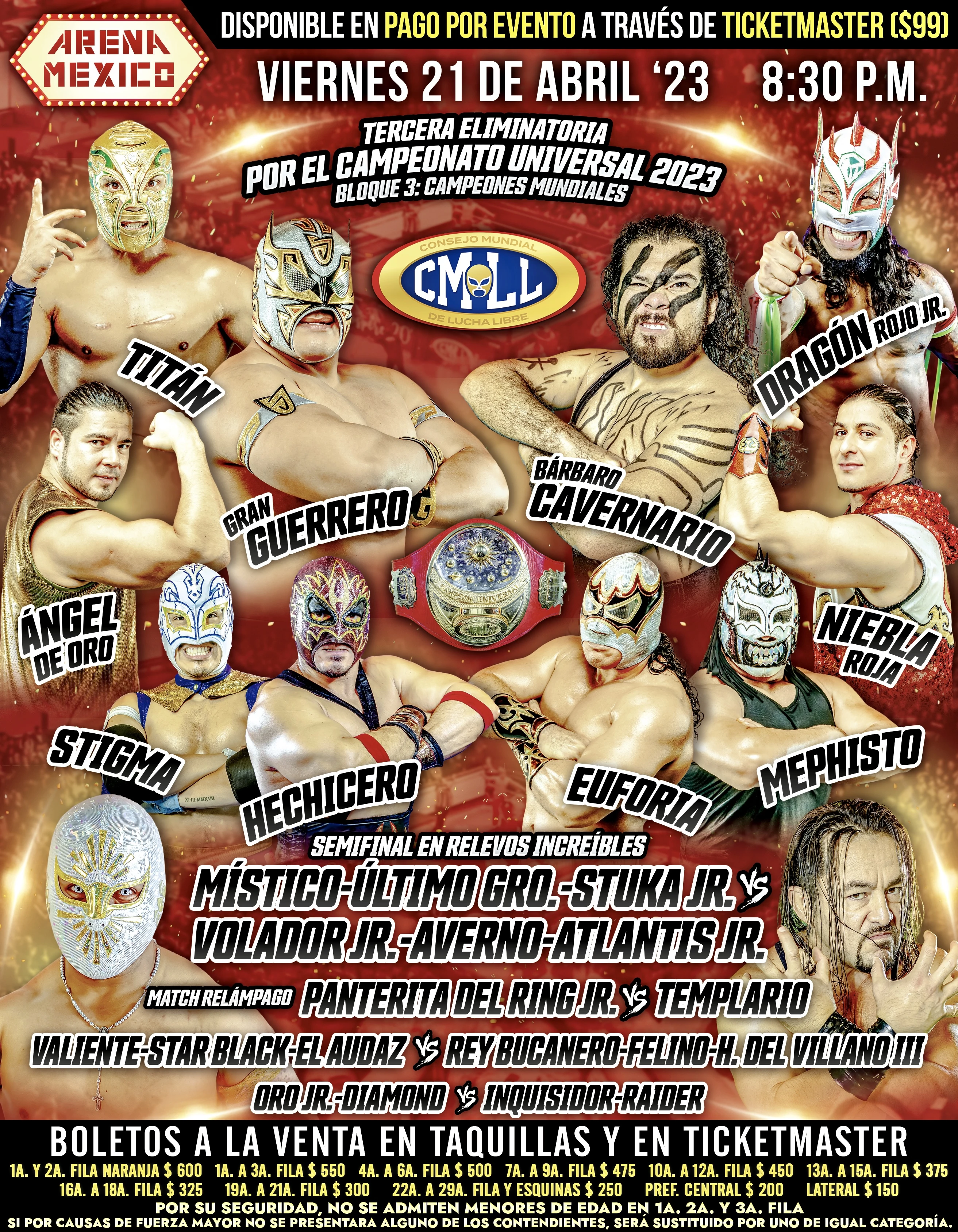 - Dragon Rojo Jr. defeated Ángel de Oro, El Barbaro Cavernario, Euforia, Gran Guerrero, Hechicero, Niebla Roja, Stigma, Titán and Mephisto in a 2023 CMLL Universal Championship Torneo Cibernetico Semi Final Match