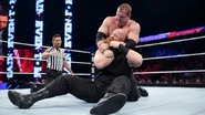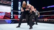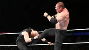 In an impressive display of strength, Erick Rowan was able to both suplex and drive Kane into the canvas with a full nelson slam. The tide turned a bit when the 300-pound monster took to the top rope and launched himself onto Rowan. Next the action spilled outside the ring, where Rowan slammed Kane onto the announce table, sending water all over guest commentator Titus O’Neil. When the two giants continued the war inside the ring, the former WWE Director of Operations asserted his dominance with a chokeslam for the win.