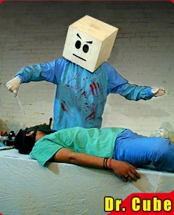 Dr. Cube is a wrestling gimmick used by several wrestlers in Kaiju Big Battel where he a mainstay major villain. Since Dr. Cube is played by different wrestlers every show, there can be a lot of differences in Dr. Cube's size, body type, and even gender. What is consistent is a giant cube head, which is made of cardboard and features a painted-on angry expression. Dr. Cube typically wears hospital scrubs, but not always.