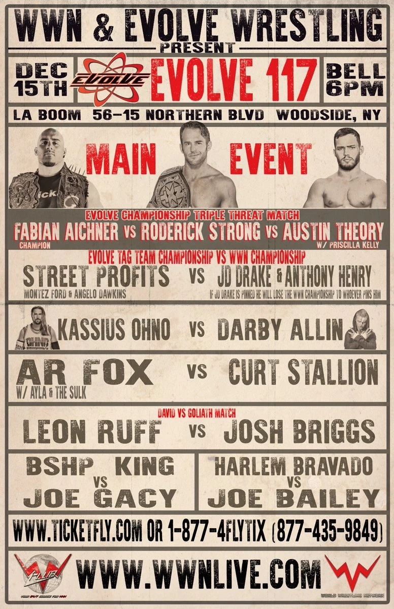 - Austin Theory defeats Fabian Aichner (c) and Roderick Strong in a Triple Threat Match to win the EVOLVE Championship
