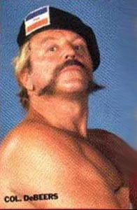 He was best known as Col. DeBeers in the American Wrestling Association (AWA) from 1985 until the organization stopped promoting in late 1990. His interviews and persona were based on a pro-Apartheid mentality and he played on the fragile race relations and political climate of South Africa at the time. He was billed as being from Cape Town, South Africa, though he bore no accent whatsoever. It was never directly mentioned, but his name was meant to link his status and wealth to the South Africa-based diamond mining and trading corporation, the DeBeers Group. DeBeers also wrestled in Herb Abrams' Universal Wrestling Federation and various promotions across the West Coast.