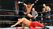 One week ago, Ted DiBiase scored a quick win over Hunico, despite the fact that the gutsy Superstar was competing with a still-injured wrist. This week, after DiBiase exacerbated his injury while executing a fierce dropkick, Camacho grabbed his damaged appendage and pulled it over the ropes with great force. This disruption allowed Hunico to roll his opponent up for a quick victory of his own.