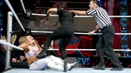 Before Natalya could celebrate her win, AJ pounced on the third-generation Diva at ringside, then tossed her back into the ring. Tamina was lying in wait and clocked Natalya with a superkick. The Divas Champion and her muscle attempted to continue their attack, but were thwarted by The Funkadactyls. AJ scampered away from the ring, leaving her bodyguard to Cameron and Naomi.