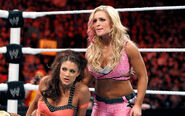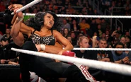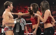 After Bryan overcame an impressive Tyson Kidd to retain his title, Brie and Nikki, who were watching ringside, unleashed a blizzard of punches on Kim, who attempted to plow through the two before order could finally be restored.