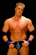 Cutler jumping onto a trapped opponent held by tag partner Jessie Godderz during their time as the "Hollywood Love Guns".