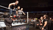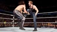 Before WWE Champion Dean Ambrose’s main event match against Kevin Owens could begin, Seth Rollins, the Superstar who will challenge for The Lunatic Fringe’s WWE Championship on Raw this Monday, made an unscheduled appearance on SmackDown commentary to lend his thoughts on the upcoming showdown. However, before the one-on-one encounter between Ambrose and Owens was a minute long, Rollins blindsided Ambrose and opened the door for a two-on-one assault on the titleholder.