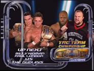 - WWE Smackdown! Tag Team Champions Paul London & Billy Kidman defeated The Dudley Boyz at 11:37 when London defeated D-Von after Rey Mysterio Jr. came out of the crowd and dropkicked a steel chair into Bubba Ray's face as he prepared to hit Kidman with the chair