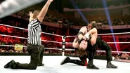 After Daniel Bryan engaged in a bizarre battle alongside a new partner on SmackDown, it fell to his brawny buddy Kane to dish out some solo hurting on The Shield's resident U.S. Champion, Dean Ambrose, on Raw. And while The Big Red Monster certainly left the Cincinnati scrapper worse for wear, it was all in the name of a Pyrrhic victory when The Shield themselves interfered in the match and awarded Kane the win by DQ.