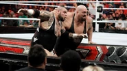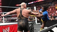 Kofi Kingston and R-Truth tried to rush out to rescue Brodus, but they were dealt a devastating beatdown as well. First, Kingston was catapulted hard into the barricade, and then R-Truth was tossed into the steel ring steps. Big Show finished off his path of destruction with a brutal WMD to The Funkasaurus' face.