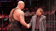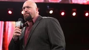 Backstage, it appeared Big Show was about to unleash more of his rage, this time on Santino Marella, but Brodus Clay stopped The World's Largest Athlete and confronted him about talking trash earlier in the show. Big Show accepted Clay's challenge for a match and made him a promise: "Forget about dancing, because after tonight, you won't be walking."
