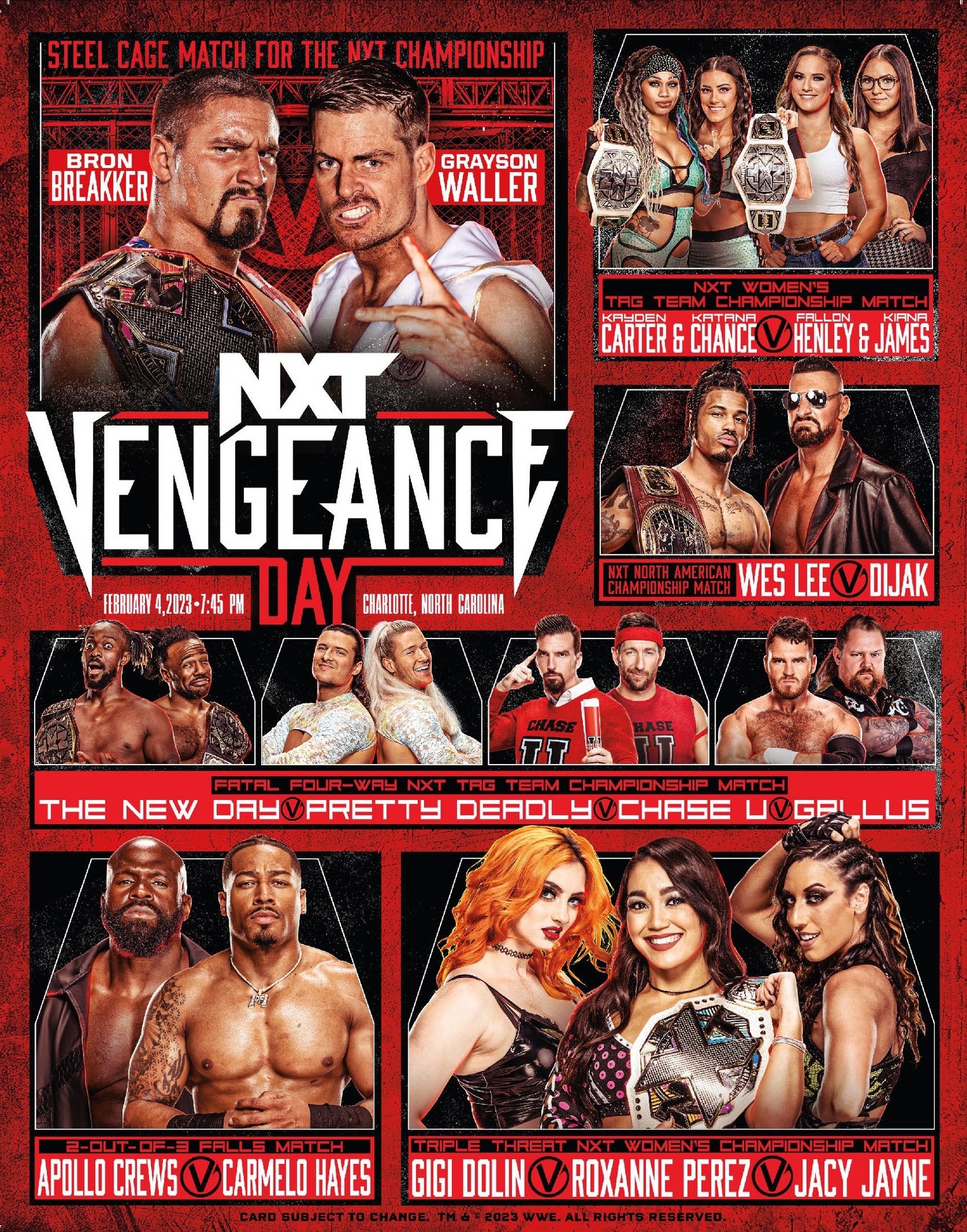 NXT Vengeance Day 2023 was a professional wrestling event produced by American promotion WWE for their NXT brand. The event took place on February 4, 2023, at the Spectrum Center in Charlotte, North Carolina. It was the eleventh Vengeance event and the third Vengeance Day event under NXT. The event was broadcast on Peacock in the United States and on the WWE Network internationally.
