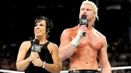 Cue the trumpets and the M.O.P. sample, because this latest insult brought out Cena, who stomped down to AJ's rescue, but found his services somewhat unwarranted: Vickie stopped the Cenation leader from decking Ziggler ... and proceeded to do the honors herself, flooring Mr. Money in the Bank with a slap to the face before finally allowing Cena to eject the shamed Showoff from the ring.