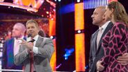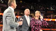 Given that he had initially been promised one opportunity at Mr. Money in the Bank, Orton came at the young Superstar — much to Triple H's horror — with everything he had and then some. So it was truly a shock when Rollins pinned Orton with a backslide outta nowhere, though not as much when Orton refused to give Rollins his promised handshake, instead replying with an RKO. That was followed by a beating from the entire Authority, punctuated by a Curb Stomp to The Viper atop the table and the steel steps, ordered by a reluctant Triple H at Stephanie McMahon's behest. The future, it seems, has come early.