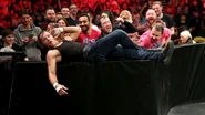 A gruesome suplex over the ropes left Cesaro with one working arm, so he adjusted and revved up the Uppercut Express with the other one, driving The Celtic Warrior over the barricade. This instigated a face-off between Rooney and King Barrett (a Preston North End fan) at ringside that ended with His Grace taking a slap across the face from the captain. A gobsmacked Sheamus was stopped dead in his tracks and Cesaro capitalized, springing a rollup to head into Round Two