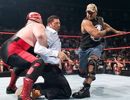 The tricks started early in the night, however. Bischoff came to the ring with Chris Masters in the beginning of the show, and they called out SmackDown's Rey Mysterio to take part in the Master Lock Challenge. Before the challenge could start, though, Mysterio attacked Masters with the microphone and slammed him face-first onto a steel chair. Bischoff called for some RAW reinforcement as Edge, Lita, Snitsky, Trevor Murdoch, Lance Cade, Kerwin White and Nick Nemeth answered the call. Theodore Long, who had accompanied Mysterio to the ring, also called for reinforcements as Matt Hardy, Hardcore Holly, JBL and Christian ran through the Anaheim crowd and stormed the ring. Mysterio hit the 619 on Masters as the RAW troops retreated. Bischoff berated his RAW soldiers, Edge and Masters in particular, and said that he refuses to lose to Long and his SmackDown at Taboo Tuesday. Edge and Masters will face any two out of Mysterio, JBL, Christian, Holly and Hardy. You can vote on who you most want to see in the match now.