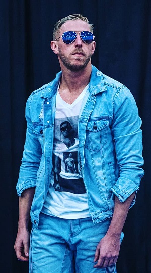 Having wrestled for over a decade and taking his current ring name around 2009, his gimmick is compared to that of Ryan Gosling's character in Drive: an aloof, somewhat hungover slacker who carries his title belt in a backpack, wearing sunglasses and a faded denim jacket and jeans with a t-shirt with his face on it.
