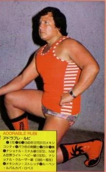 Rubi Rubalcaba (December 31, 1943 - June 24, 2012) was a Mexican Luchador, or professional wrestler who is best known under the ring name Adorable Rubí. As Adorable Rubí he was one of the pioneers of the Exotico wrestling style, mixing Cross-dressing with wrestling to create sexually ambiguous characters. The Adorable Rubí character was inspired by Dizzy Gardenia, the first successful Exotico character. Adorable Rubí, Sergio el Hermoso and Bello Greco formed a group called Ola Lila (the "Lilac Wave") who wrestled all over Mexico. Of the three Adorable Rubí saw the most success in the ring, defeating Ciclón Veloz, Jr. to win the Mexican National Middleweight Championship on April 6, 1971. Rubí held the title for 196 days before losing the belt to Aníbal on June 28, 1974. on February 27, 1976 Empresa Mexicana de Lucha Libre (EMLL) bookers decided to make Adorable Rubí the new NWA World Light Heavyweight Champion, EMLL's most prestigious championship. Rubí defeated Dr. Wagner for the title, holding it for 231 days before losing the belt to Carlos Plata on July 16, 1976. On October 7, 1984 he became the second man to hold the Mexican National Cruiserweight Championship when he defeated Ángel Blanco to win the title, a title he would lose to Charro de Jalisco in 1986, not long before he retired from professional wrestling.