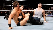 Despite the emergence of Seth Rollins and Corporate Kane in SmackDown's opening contest, Dean Ambrose was able to counter The Miz's Skull-Crushing Finale and hit Dirty Deeds for the victory over the “Moneymaker.” The unstable Superstar then singlehandedly held off the 2-on-1 assault from Rollins and Kane to steal the Money in the Bank briefcase!