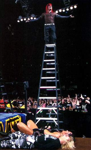 Jeff Hardy and CM Punk in the 8th WWE Tables, Ladders, and Chairs match.