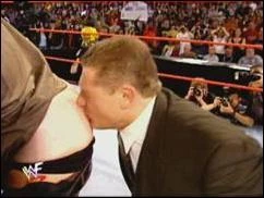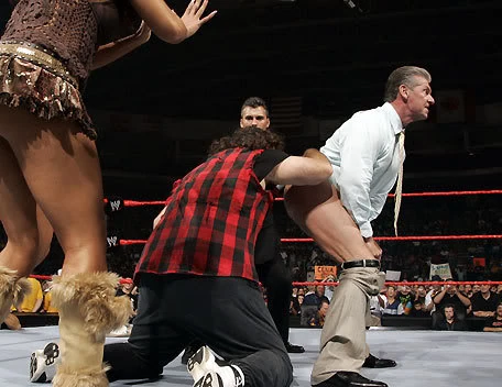 On the Feb 10, 2003 episode of Raw, To save his job, Eric Bischoff, who was long known for being quite tyrannic, had to kiss Vince's ass. Wiggling his pants and underwear off and showing off his ass's "tricks", Vince waited patiently for Eric to pucker up. Bishoff, however, chickened out and stated he simply cannot do it. Vince took this as an insult and made Bischoff instead join the "Get My Ass Kicked Club" and made him compete against Stone Cold at No Way Out!