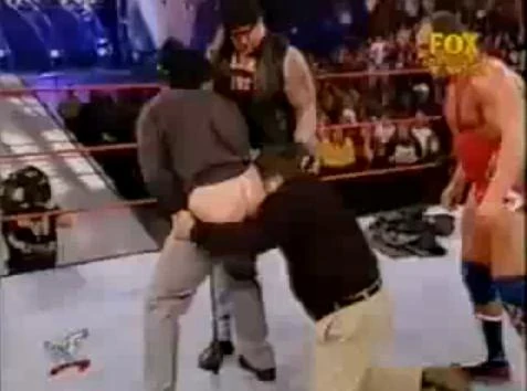 After catching him laugh after his failed attempt at forcing Stone Cold to join, Mr. McMahon forced Ross to kiss his ass so that everyone who laughed can kiss his ass through Ross. Undertaker interrupted in what seemed a breakthrough for Ross, but quickly teamed up with McMahon and Kurt Angle by making Ross kiss his bare ass (and hug it) while Mcmahon proudly wore his hat.
