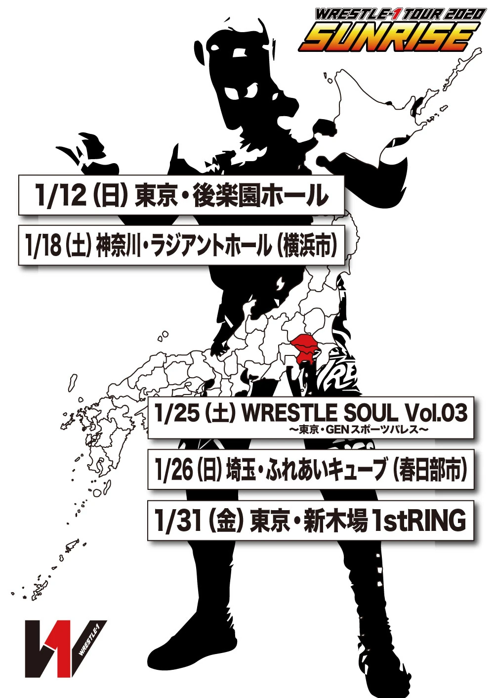 | Sunrise - Night 1 • Sunrise - Night 2 • ACE Vol. 2 • Sunrise - Night 3 • Sunrise - Night 4 • New Year Fighting Festival • Impact - Night 1 • W-Impact - Night 2 • ACE Vol. 3 • W-Impact - Night 3 • Trans Magic - Night 1 • Trans Magic - Night 2 • Trans Magic - Night 3 • Trans Magic - Night 4 • ACE Vol. 4 • Cherry Blossom - Night 1 • The Golden Battle In Kobe FOP Assistance Charity Convention • WRESTLE-1 Tour Cherry Blossom - Night 2 • WRESTLE-1 Tour Cherry Blossom - Night 3 • WRESTLE-1 Tour Triumph - Night 1 • WRESTLE-1 Tour Triumph - Night 2 • WRESTLE-1 Tour Triumph - Night 3 • WRESTLE-1 Tour Triumph - Night 4 • WRESTLE-1 Tour Triumph - Night 5 • WRESTLE-1 Tour Outbreak - Night 1 • WRESTLE-1 Tour Outbreak - Night 2 • WRESTLE-1 Tour Outbreak - Night 3 • WRESTLE-1 Tour Outbreak - Night 4 • WRESTLE-1 Tour Outbreak - Night 5 • WRESTLE-1 Tour Symbol - Night 1 • WRESTLE-1 Tour Symbol - Night 2 • WRESTLE-1 Tour Symbol - Night 3 • WRESTLE-1 Tour Flashing Summer - Night 1 • WRESTLE-1 Tour Flashing Summer - Night 2 • WRESTLE-1 Tour Flashing Summer - Night 3 • Pro-Wrestling Love In Yokohama • WRESTLE-1 Tour 4th Anniversary - Night 1 • WRESTLE-1 Tour 4th Anniversary - Night 2 • WRESTLE-1 Tour 4th Anniversary - Night 3 • WRESTLE-1 Tour Updraft - Night 1 • WRESTLE-1 Tour Updraft - Night 2 • WRESTLE-1 Tour Updraft - Night 3 • WRESTLE-1 Tour Autumn Bout - Night 1 • WRESTLE-1 Tour Autumn Bout - Night 2 • WRESTLE-1 Tour Autumn Bout - Night 3 • WRESTLE-1 Tour Shining Winter |